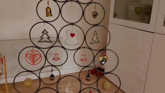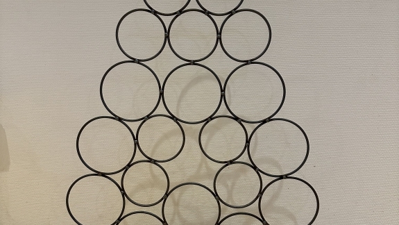 Juletræ med 20 ringe Ringe måler 13 og 16cm Højde 110cm Bredde 70cm Pris: 350kr Billede med pynt for inspiration